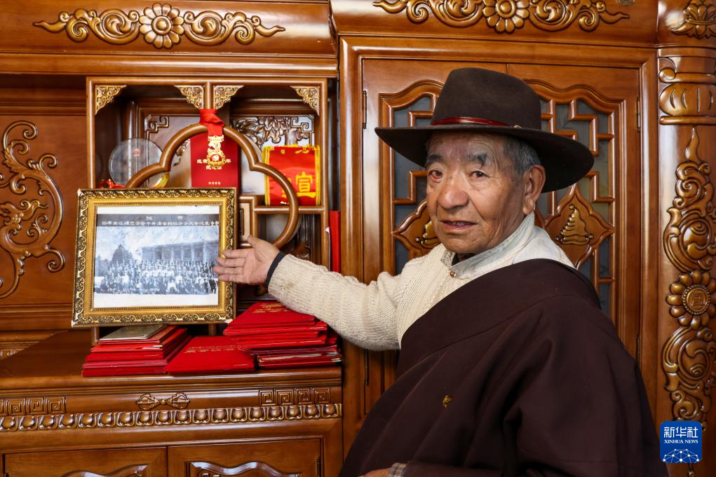 扎巴旺旦在展示自己獲得的榮譽和參加活動的合影(3月11日攝)。新華社記者 姜帆 攝
