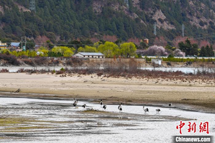 圖為黑頸鶴在河邊覓食。貢嘎來(lái)松 攝