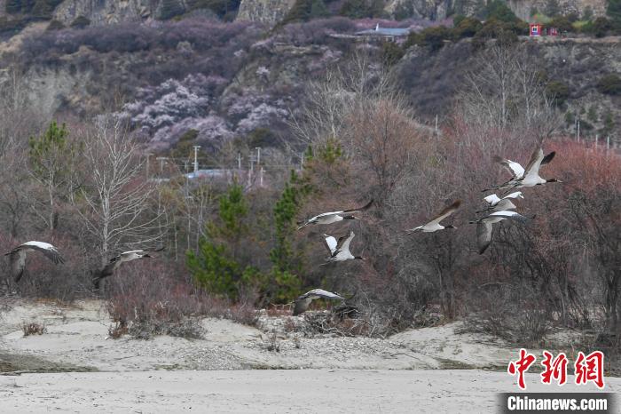 圖為桃花前飛翔的黑頸鶴。貢嘎來(lái)松 攝