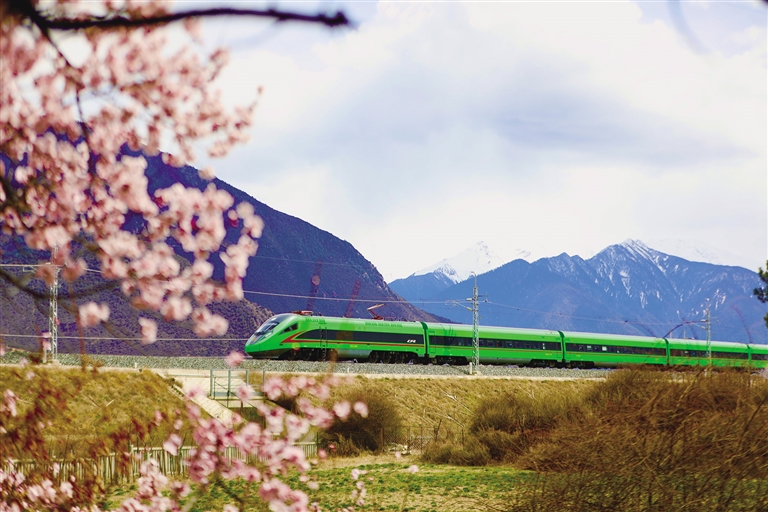 自2021年拉林鐵路開通以來,“搭乘復(fù)興號(hào)去看桃花”已成為更多游客的選擇。作為連接“日光城”拉薩和“雪域江南”林芝的“新天路”,拉林鐵路串起了西藏東南地區(qū)的“精華”風(fēng)景,乘坐拉林鐵路列車,不僅能體驗(yàn)到世界最高海拔運(yùn)行的動(dòng)車速度,還可以透過車窗盡情欣賞雅魯藏布江兩岸壯觀的桃花林,飽覽雪域高原的壯麗美景。