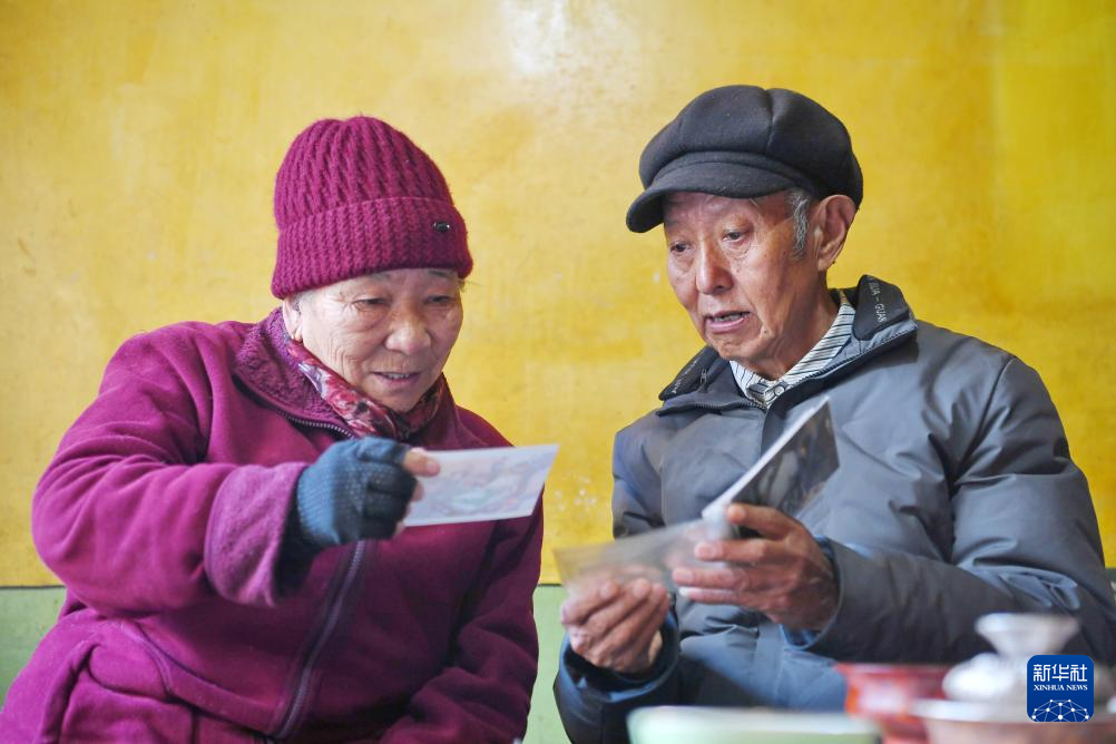 洛桑貢布(右)和老伴次仁白姆翻看老照片(3月27日攝)。