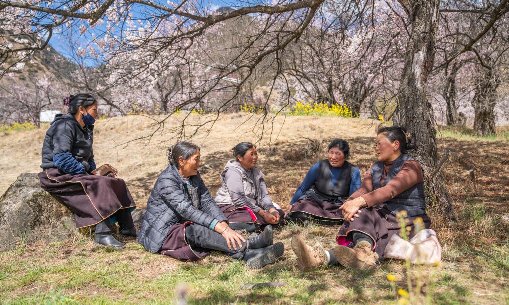午休時,尼瑪曲吉(右二)與村民在桃樹下聊天(4月1日攝)。新華社記者 丁增尼達(dá) 攝