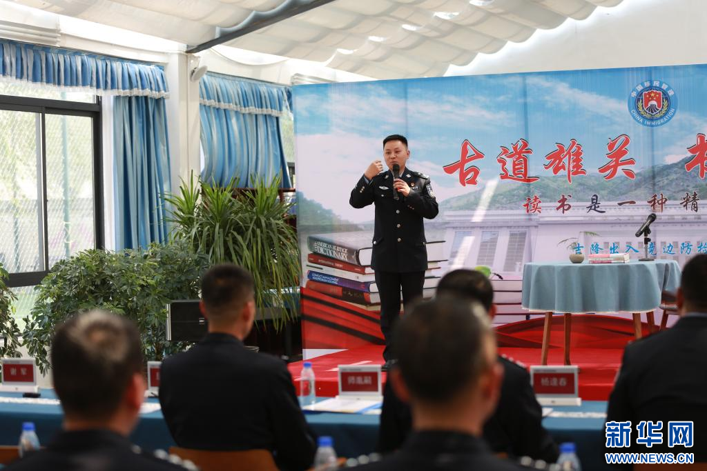 在“古道雄關(guān) 書香國門”主題讀書分享會(huì)上分享者黃耀軍正在向全站移民管理警察分享讀書心得(4月19日攝)。肖富貴 攝