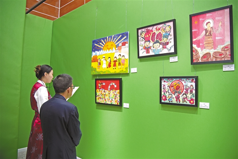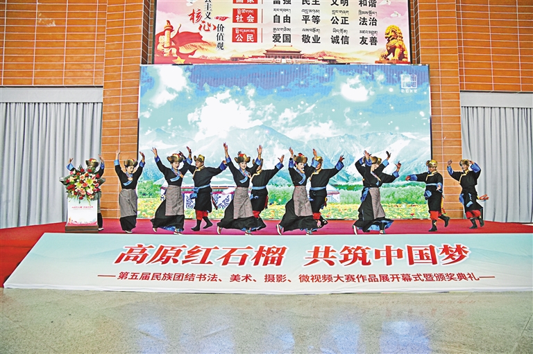 28日,“高原紅石榴 共筑中國(guó)夢(mèng)”第五屆民族團(tuán)結(jié)書法、美術(shù)、攝影、微視頻大賽作品展開幕式暨頒獎(jiǎng)典禮在西藏自然科學(xué)博物館舉行。此次展覽將持續(xù)至5月8日。