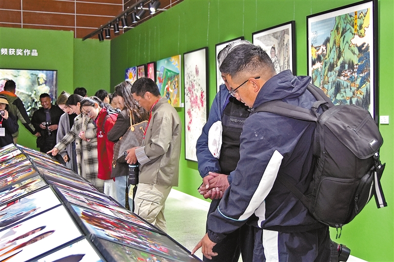 圖為觀眾在觀看攝影獲獎(jiǎng)作品。