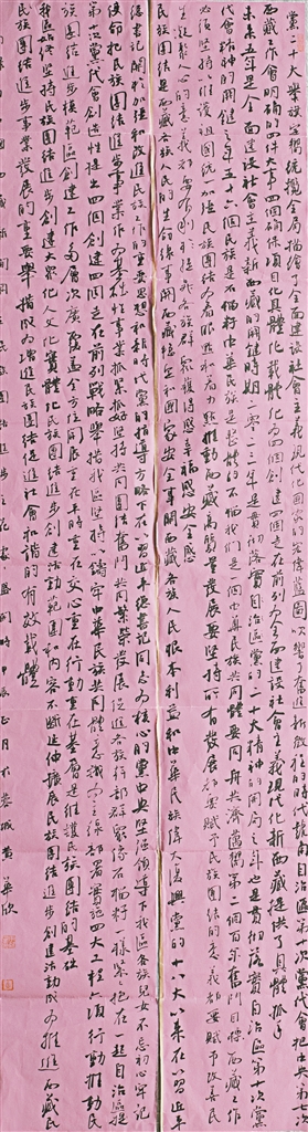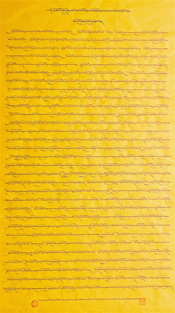 藏文書法一等獎(jiǎng)作品《在黨的民族政策光輝照耀下各族人民繁榮發(fā)展》。作者 索朗歐珠