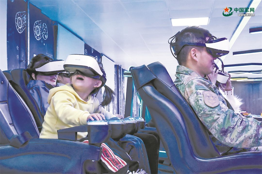 該旅營區(qū)環(huán)境已今非昔比,各種設(shè)施日益完善,官兵及其家人在軍營團聚,臉上滿是幸福。該旅官兵帶著家人體驗VR模擬設(shè)備。張子欽 攝