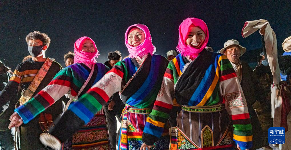 當?shù)厝罕娫诩{木錯開湖篝火晚會現(xiàn)場跳鍋莊(5月18日攝)。新華社記者 丁增尼達 攝