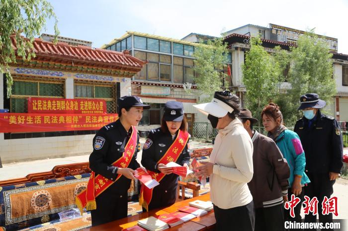 活動現(xiàn)場,西藏邊檢總站執(zhí)法調(diào)查支隊民警通過懸掛橫幅、發(fā)放宣傳資料、現(xiàn)場答疑等方式,向民眾普及《民法典》知識。
