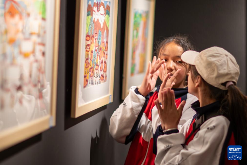 6月5日,拉薩市特殊教育學(xué)校的孩子在參觀作品展覽時(shí)用手語(yǔ)交流。新華社記者 姜帆 攝
