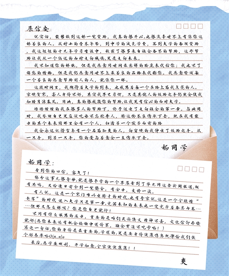 一位名叫葉珺的女生,看到江西勵志女孩佳琦的報道后,給這位千里之外素未謀面的“妹妹”寫了一封信,“我本來不輕易跟別人說自己的經(jīng)歷,但是看到佳琦的情況后特別感同身受,我覺得將自己的心聲傳達給這個小妹妹很有意義?!?/p>