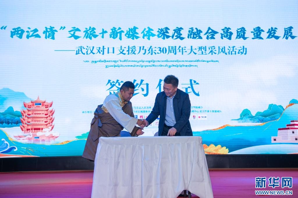6月20日,啟動(dòng)儀式現(xiàn)場(chǎng),武漢廣播電視臺(tái)與乃東區(qū)融媒體中心簽署合作協(xié)議。新華網(wǎng) 旦增努布 攝