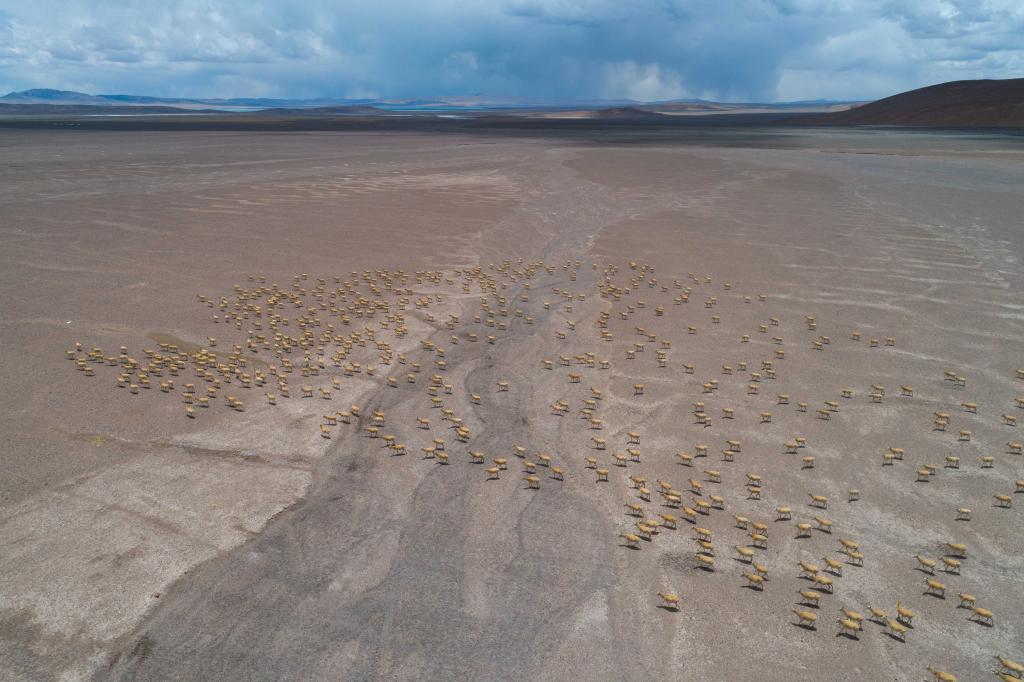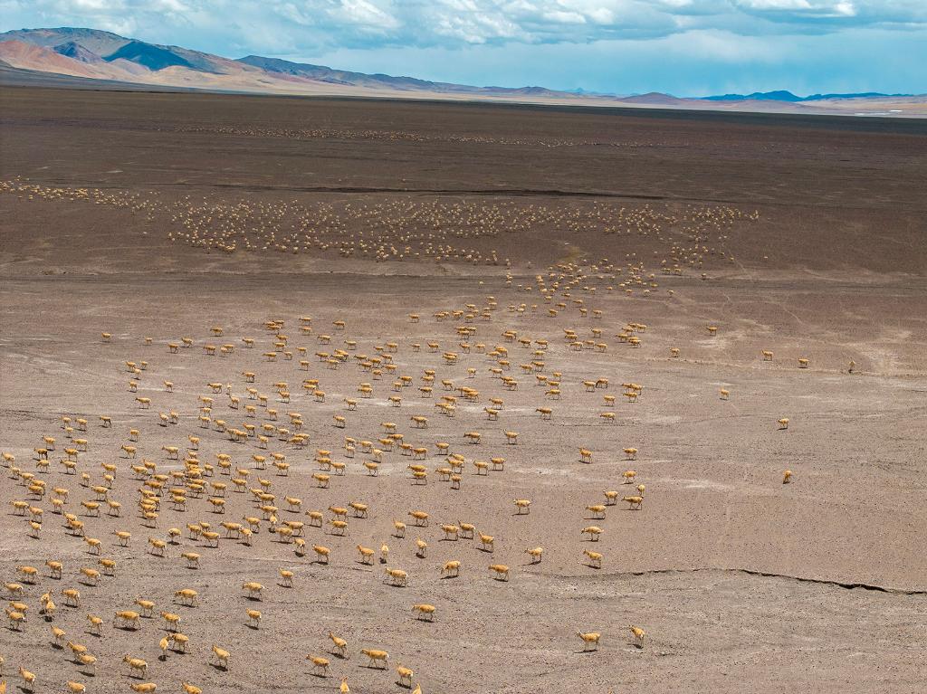 2024年5月10日,在羌塘國家級(jí)自然保護(hù)區(qū),大群懷孕的雌性藏羚羊開始集結(jié)成群,向產(chǎn)羔地遷徙。