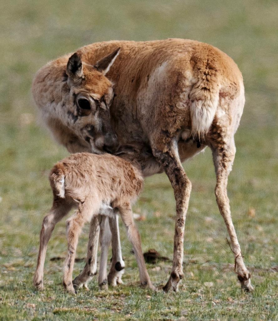 2024年6月17日,羌塘國家級(jí)自然保護(hù)區(qū)境內(nèi)的西藏那曲市申扎縣買巴鄉(xiāng)魯確塘草原上一只剛出生不久的小藏羚羊在吃奶。