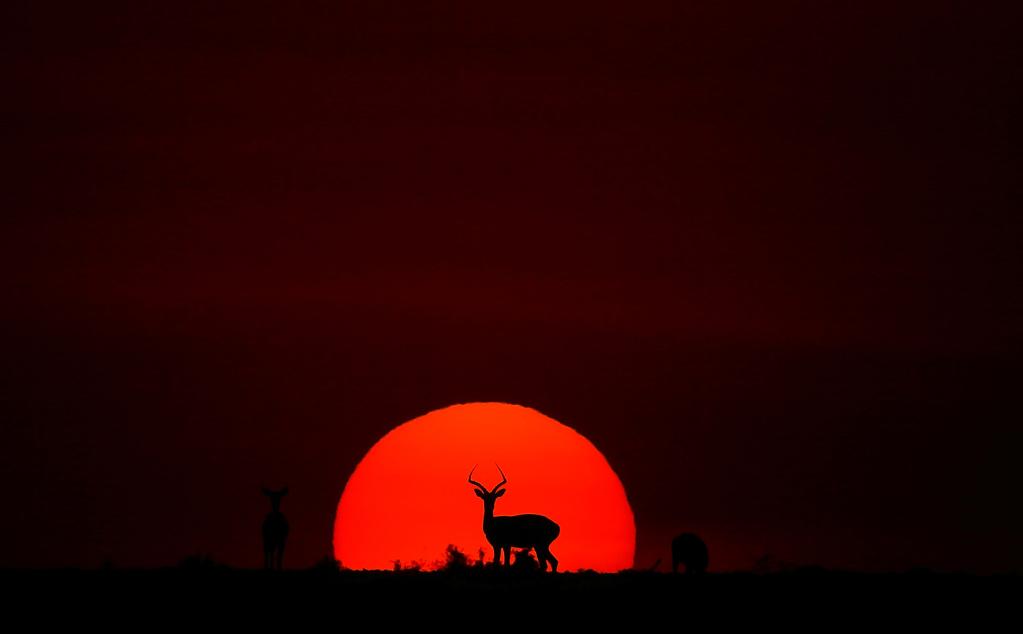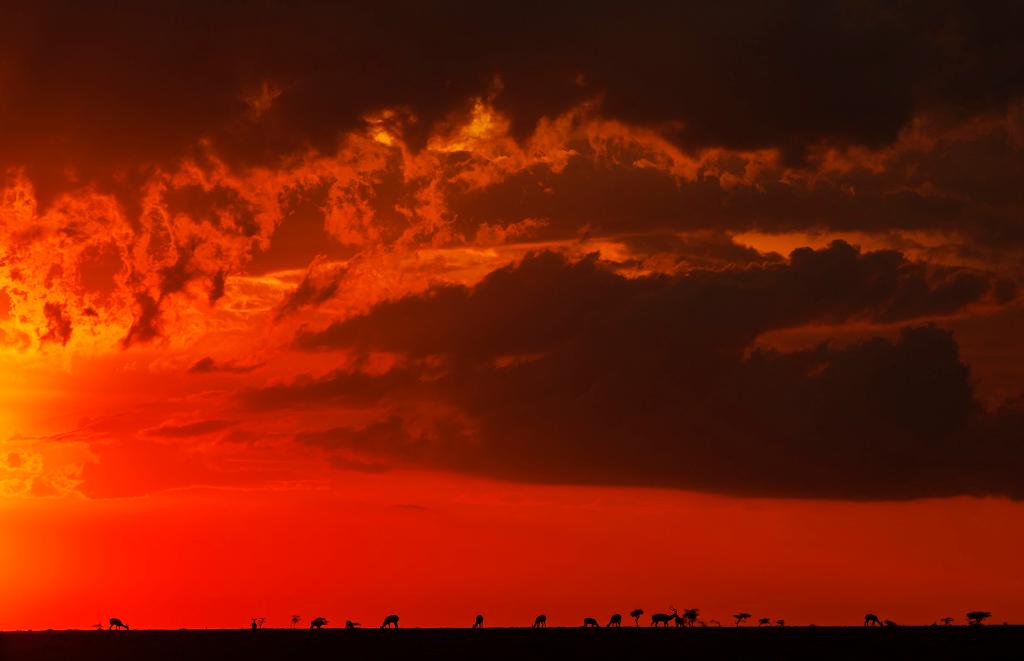 ↑ 在馬賽馬拉國家保護(hù)區(qū),遷徙中的野生動(dòng)物在夕陽下覓食。