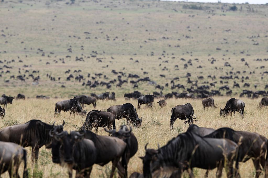 ↑ 在馬賽馬拉國家保護(hù)區(qū),遷徙中的野生動(dòng)物在草原上覓食。
