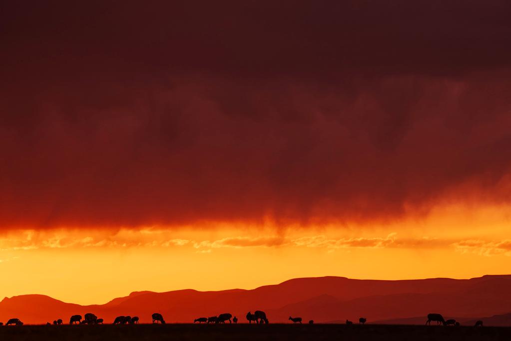 ↑ 在羌塘國家級(jí)自然保護(hù)區(qū),藏羚羊在夕陽下覓食。