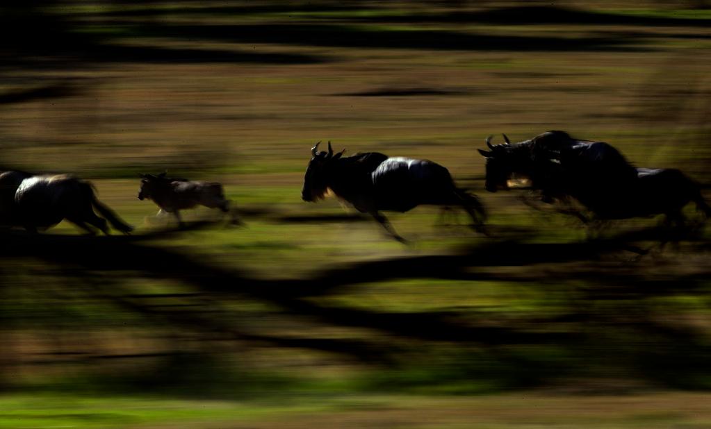 ↑ 在馬賽馬拉國家保護(hù)區(qū),遷徙中的角馬因?yàn)楦惺艿侥撤N危險(xiǎn)而奮力奔跑。