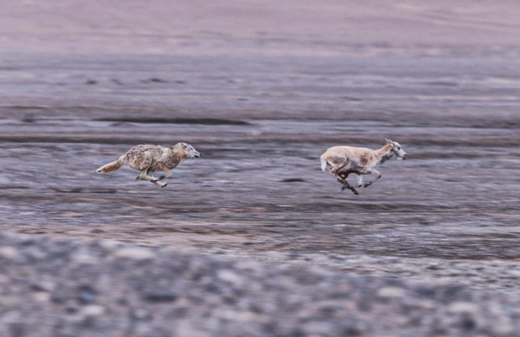 ↑ 在羌塘國家級(jí)自然保護(hù)區(qū),一只野狼正在捕食遷徙中的母藏羚羊。在藏羚羊的遷徙過程中,野狼、雪豹、藏馬熊和藏野狐等掠食動(dòng)物守候在遷徙路上,隨時(shí)準(zhǔn)備捕食。
