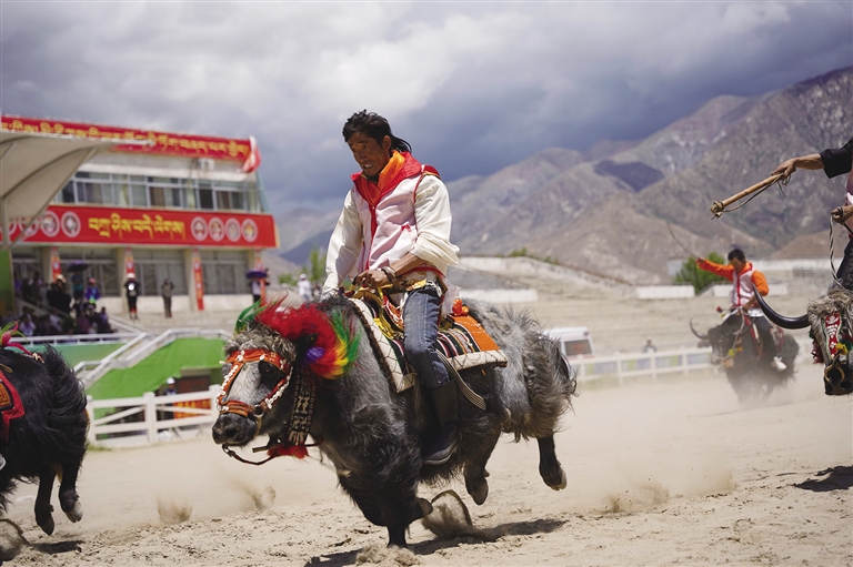 此時,賽場另一邊傳來歡呼,循聲望去,原來是本屆運動會的賽牦牛正在進行。雖然牦牛生性溫和,但讓它們聽命令奔跑,也并不容易。記者了解到,參加本屆運動會的牦牛均由主人精挑細(xì)選,主人一聲吹哨,輕微地蹬腳,牦牛就會按指令向前行進,顯得默契十足。但偶爾也會發(fā)生小狀況,比如牦牛分不清方向擠成一團,跑著跑著就停頓休息,或者原路返回等,引得觀眾頻頻發(fā)笑。