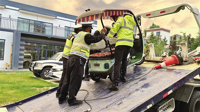 6月19日18時許,記者來到拉薩市城關區(qū)江蘇東路與嘎瑪貢桑路交叉口,此時正值下班高峰期,各類車輛川流不息,十分繁忙,拉薩市公安局交警支隊城南大隊的民警們一邊疏導交通,一邊開展電動三輪、四輪車專項整治行動。沒過多久,一輛電動三輪車準備通過路口,民警丹增發(fā)現該車輛存在非法改裝現象,便立即上前將車輛引導至安全位置,檢查后發(fā)現駕駛人私自為車輛加裝遮陽篷,上路行駛存在較大安全隱患,便按照相關法律法規(guī)暫扣車輛。丹增告訴記者:“我們會將暫扣的車輛統一停放,等駕駛人接受處罰并提交相關資料后,才能領回車輛?!?/p>