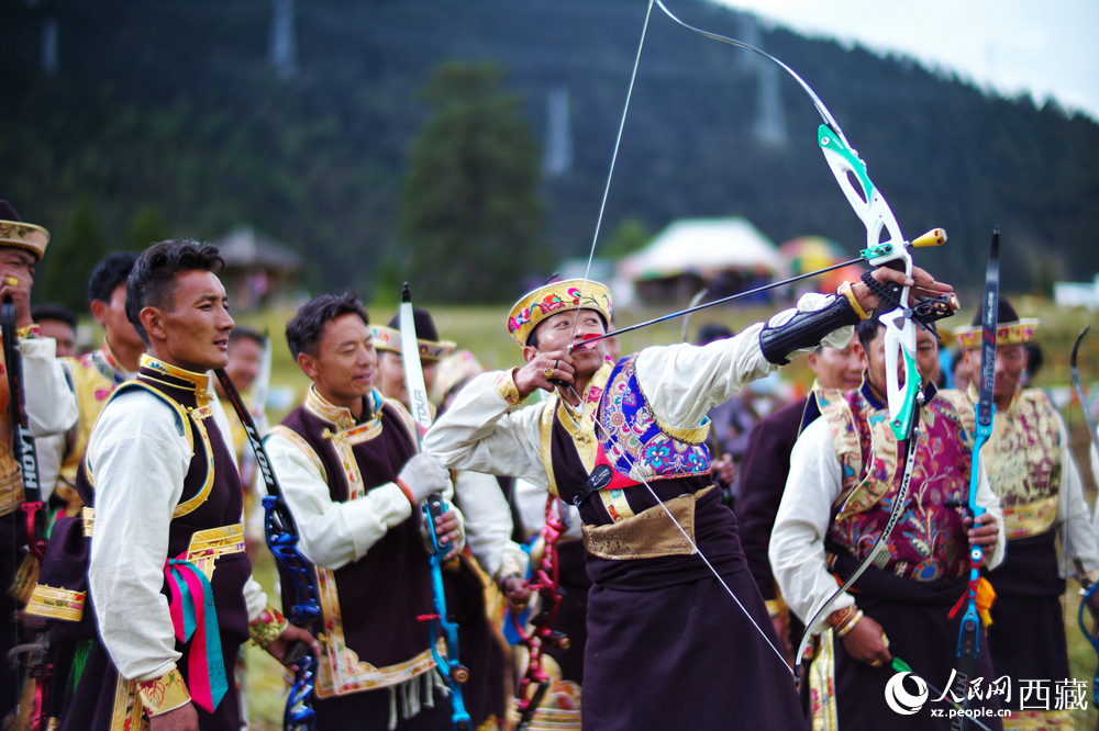 工布牧歌旅游文化節(jié)上,當(dāng)?shù)卮迕裾趨⒓由浼荣?。人民日?qǐng)?bào)記者 瓊達(dá)卓嘎攝