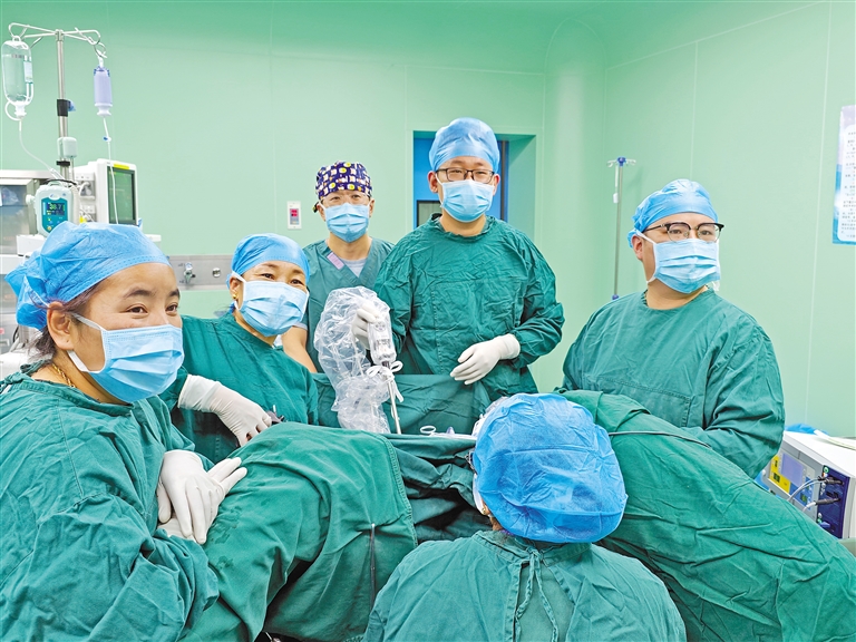 上海援藏醫(yī)療專家隋孟松(右一)帶領(lǐng)本地婦科醫(yī)生開(kāi)展日喀則市首例腹腔鏡下全子宮切除手術(shù)。