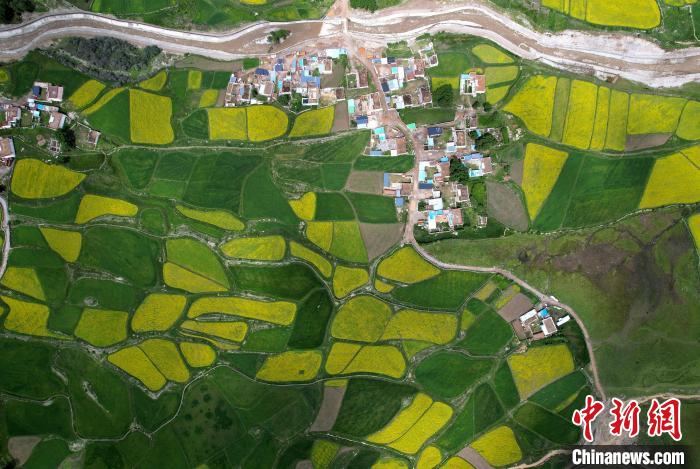 盛夏,西藏墨竹工卡油菜花盛放,一片金黃,風(fēng)光宜人。油菜花與綠油油的青稞地以及藏式民居,共同繪就鄉(xiāng)村美麗畫卷。圖為7月10日,拉薩市墨竹工卡縣油菜花盛放。(無人機(jī)照片)中新社記者 李林 攝