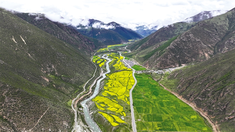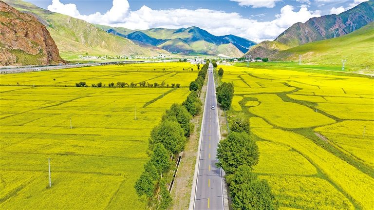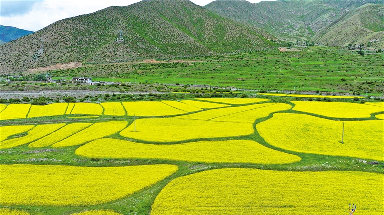 最近,墨竹工卡縣迎來(lái)了油菜花的盛開(kāi)時(shí)節(jié)。放眼望去,滿(mǎn)目的油菜花如同金黃色的毯子般鋪展開(kāi)來(lái),在微風(fēng)中搖曳,散發(fā)出迷人的香氣。一團(tuán)團(tuán)、一簇簇的金黃色花朵點(diǎn)綴在田野上,流動(dòng)著濃濃夏意。成片的花海與蜿蜒的農(nóng)村公路、錯(cuò)落有致的村居共同構(gòu)成了一幅和諧美麗的田園風(fēng)景圖。