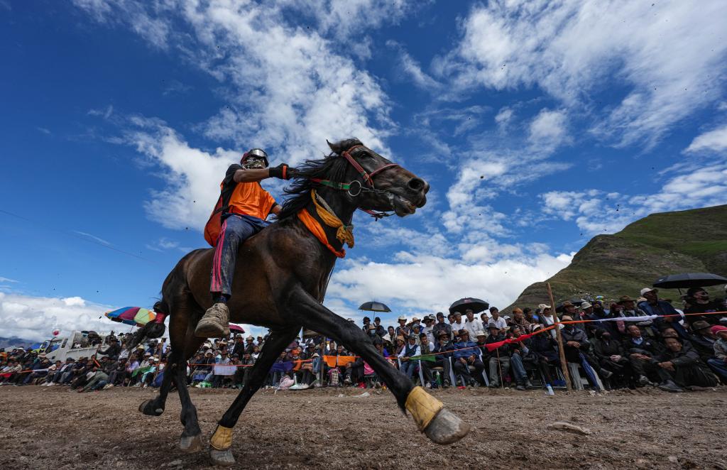 23日,在拉薩林周縣甘旦曲果鎮(zhèn)江角村的賽馬場上,選手邊瑪益丹穿著輕便的馬術(shù)運動服,上身貼緊棕色馬背,右手的馬鞭在空中打著旋,和他的愛馬進(jìn)行最后沖刺。
