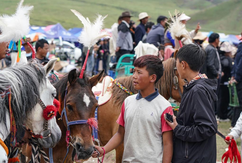 7月23日,一名小騎手欣賞對手的賽馬。新華社記者 晉美多吉 攝