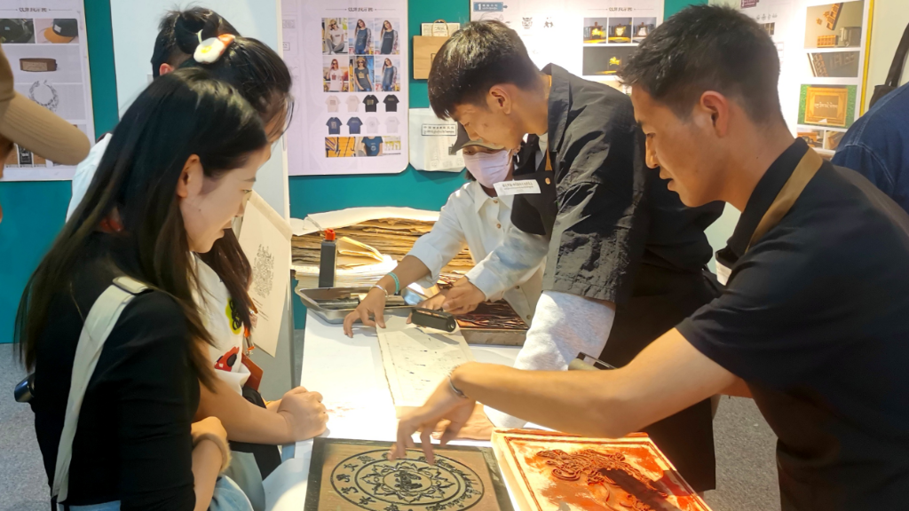 在文創(chuàng)區(qū),雕版被玩得“腦洞大開”。一組搶眼的提燈,燈面是矢量處理的拓片圖案,它帶手柄的木框正是西藏雕版的傳統(tǒng)形狀。手機(jī)殼、鑰匙扣、文化衫和帆布包也印刻上雕版圖案,連同親手完成的拓片一起,成為“帶得走”的“文物”。