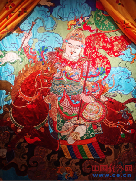 圖為羅布堆繡唐卡作品《格薩爾王》局部。 中國經(jīng)濟網(wǎng)記者 魏金金/攝