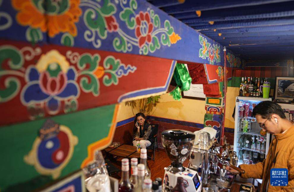 位于八廓南街的貢桑孜大院,擁有百年歷史的藏式樓房,如今煥發(fā)出新的生機(jī)。走進(jìn)大院,一樓的西北角,一間藏式裝修風(fēng)格的咖啡館內(nèi),顧客穿梭其中,咖啡香氣四溢,讓這座古老的大院充滿活力。