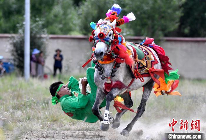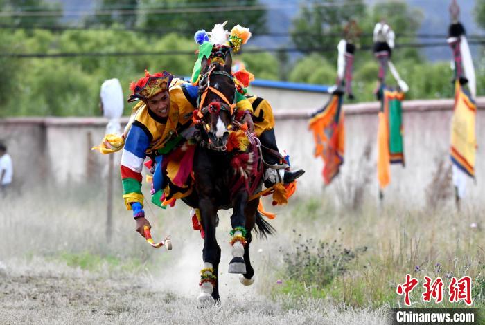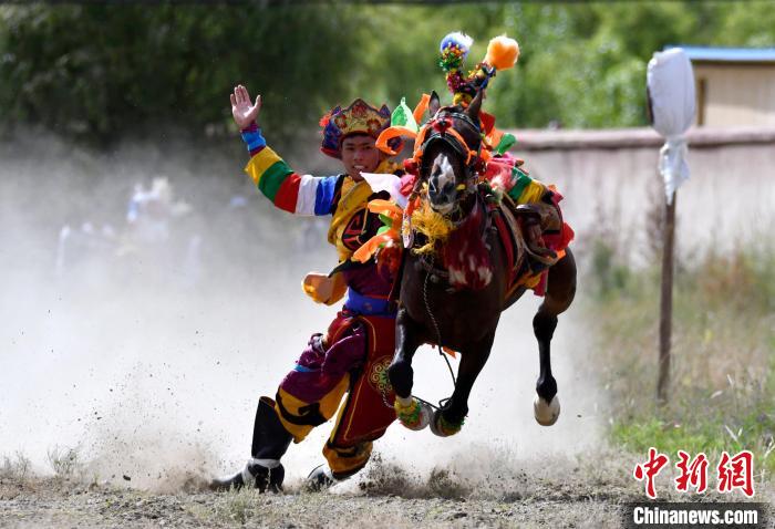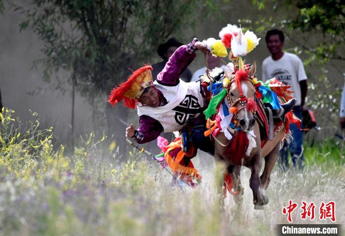 7月27日,西藏拉薩市桑達(dá)村迎來“望果節(jié)”,村民們舉行賽馬活動慶祝?!巴?jié)”是西藏傳統(tǒng)的豐收節(jié),具體日期隨各地莊稼成熟的時間而變化。“望果節(jié)”期間,按照習(xí)俗,各地都會舉辦賽馬比賽。圖為騎手進(jìn)行馬術(shù)表演。中新社記者 李林 攝