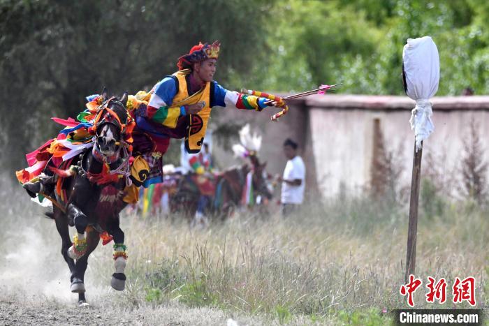 7月27日,西藏拉薩市桑達(dá)村迎來“望果節(jié)”,村民們舉行賽馬活動慶祝?!巴?jié)”是西藏傳統(tǒng)的豐收節(jié),具體日期隨各地莊稼成熟的時間而變化?!巴?jié)”期間,按照習(xí)俗,各地都會舉辦賽馬比賽。圖為騎手進(jìn)行馬上射箭表演。中新社記者 李林 攝