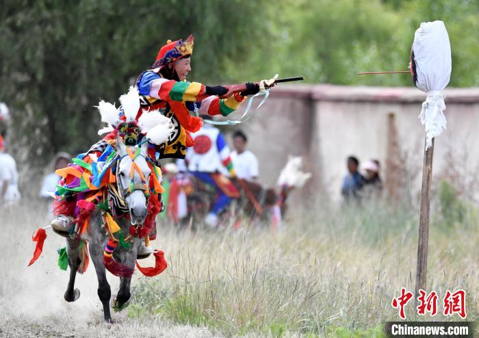 7月27日,西藏拉薩市桑達(dá)村迎來“望果節(jié)”,村民們舉行賽馬活動慶祝?!巴?jié)”是西藏傳統(tǒng)的豐收節(jié),具體日期隨各地莊稼成熟的時間而變化?!巴?jié)”期間,按照習(xí)俗,各地都會舉辦賽馬比賽。圖為騎手進(jìn)行馬上射擊表演。中新社記者 李林 攝