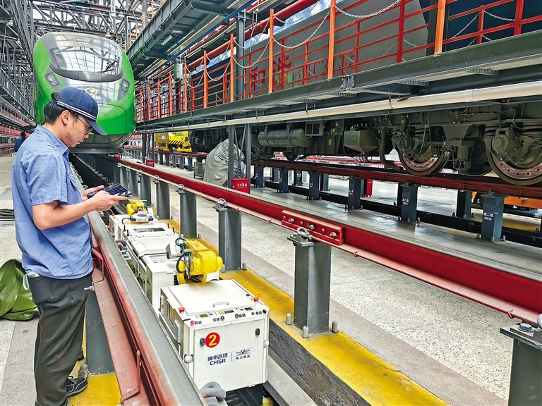 中國鐵路青藏集團(tuán)有限公司格爾木機(jī)務(wù)段拉薩機(jī)輛整備中心動(dòng)集檢修庫是動(dòng)車檢修基地,擔(dān)負(fù)著動(dòng)車組的日常檢修、定期修及專項(xiàng)修任務(wù)。在暑運(yùn)客流高峰期間,三組動(dòng)車組全部上線運(yùn)行,該段加大對(duì)動(dòng)車組入庫檢修整備力度,采用智能檢測機(jī)器人對(duì)高原動(dòng)集軌旁、車底部進(jìn)行自動(dòng)檢測、分析及診斷,并對(duì)相關(guān)部位零部件外觀故障進(jìn)行識(shí)別和報(bào)警,實(shí)現(xiàn)了“人檢”向“機(jī)檢”的轉(zhuǎn)變。