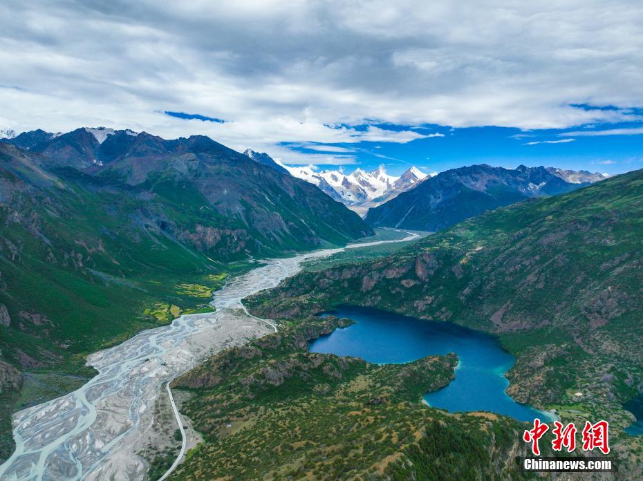圖為三色湖旁邊的冰雪融化的河流。(無人機照片)中新社記者 貢嘎來松 攝