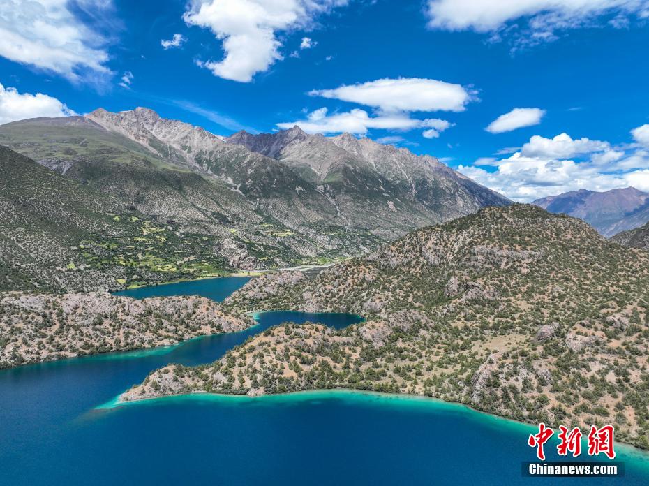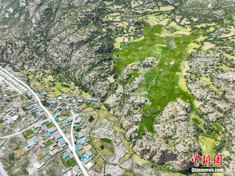 圖為三色湖旁邊的普玉村。(無人機照片)中新社記者 貢嘎來松 攝