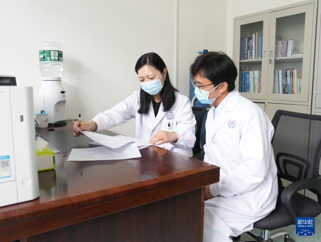 在西藏自治區(qū)人民醫(yī)院,徐鐘慧(左)與徒弟旦增晉美在辦公室內(nèi)交流(8月9日攝)。新華社記者 丁汀 攝