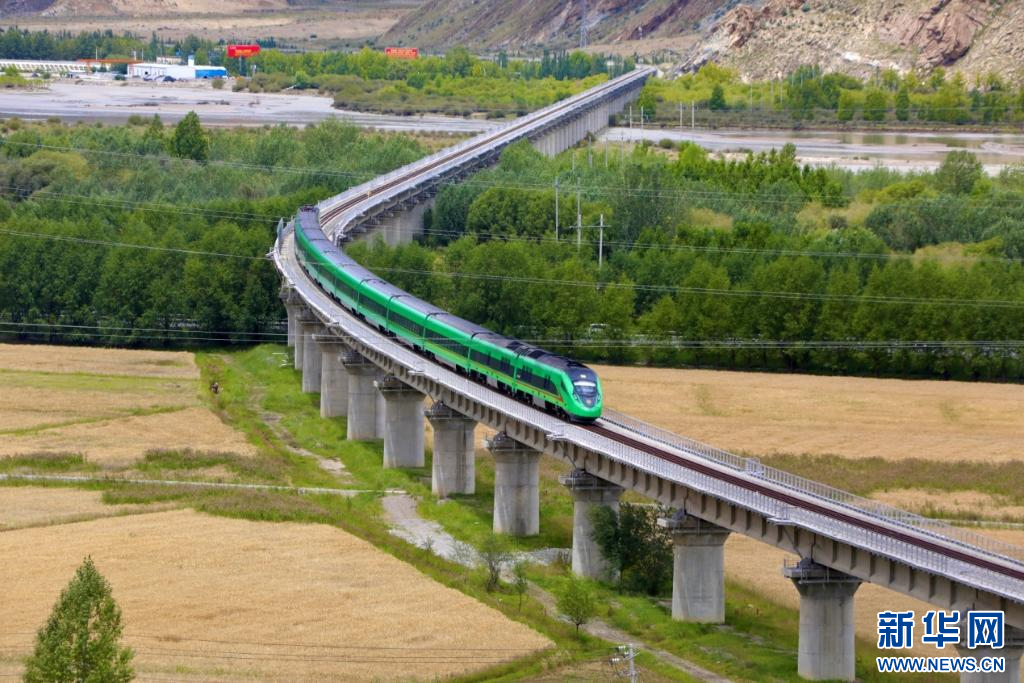 復(fù)興號動車組穿過拉日鐵路拉薩河大橋。新華社發(fā)(馬生明 攝)