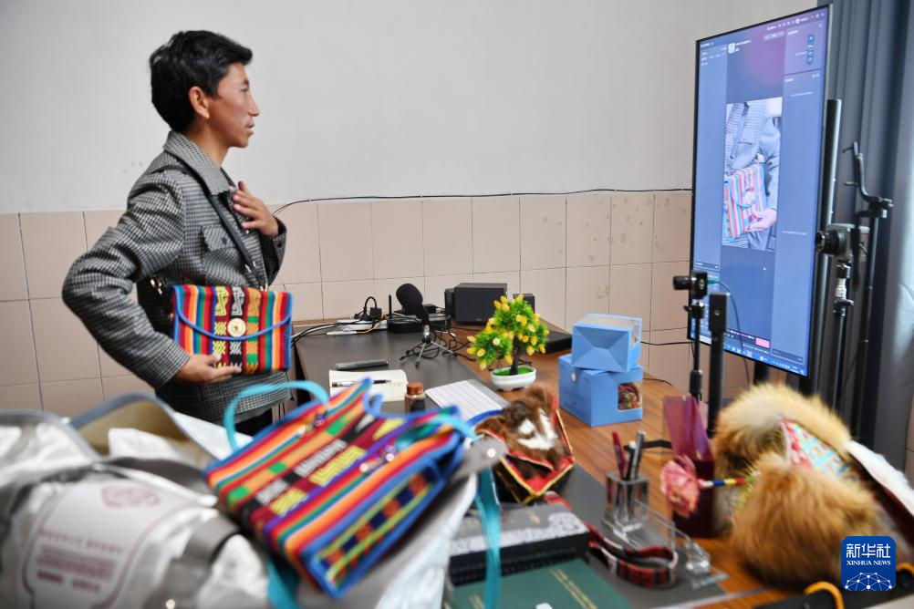 倉秋多吉通過網(wǎng)絡銷售當?shù)氐漠a(chǎn)品(8月24日攝)。新華社記者 張汝鋒 攝