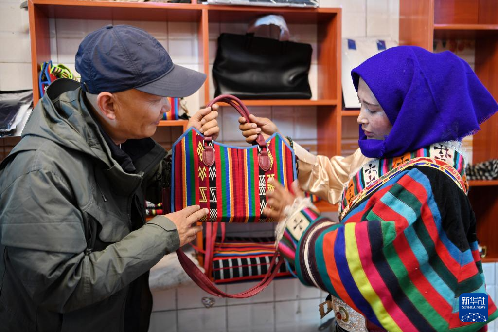 一名來自上海的游客(左)在安多托尕爾倉游牧產(chǎn)業(yè)有限責任公司展廳挑選產(chǎn)品(8月24日攝)。新華社記者 張汝鋒 攝