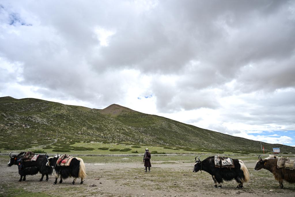 9月8日,在普蘭縣巴嘎鄉(xiāng)崗莎村,牧民正在驅(qū)趕牦牛運送轉(zhuǎn)山游客的貨物。新華社記者孫瑞博 攝