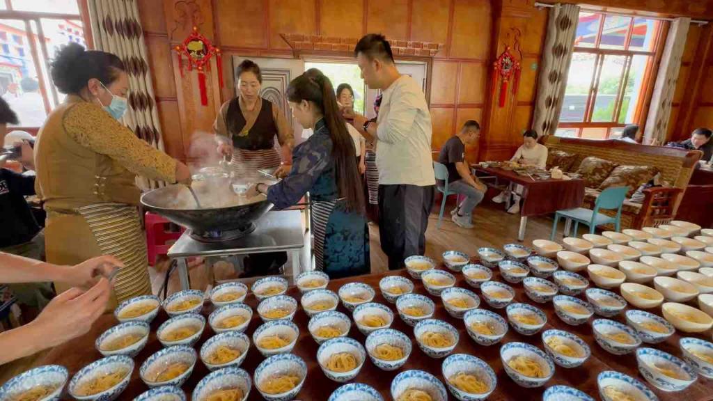 “目前店里紀錄保持在147碗?!痹诩{西民族鄉(xiāng)經(jīng)營果拉叢農(nóng)家樂的果拉卓瑪說,“但生活再好也不能浪費。我們會提醒客人,如果吃飽了,只需用筷子在碗上搭出尖尖,就會停止加面;但對于不搭筷子的客人,我們還會再勸一碗?!?/p>