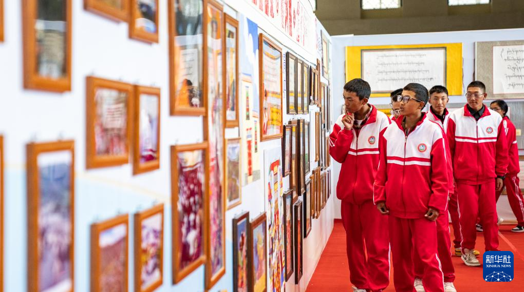 學生在西藏首屆中小學生藝術展演活動獲獎作品展廳內(nèi)參觀(9月25日攝)。新華社記者 丁增尼達 攝