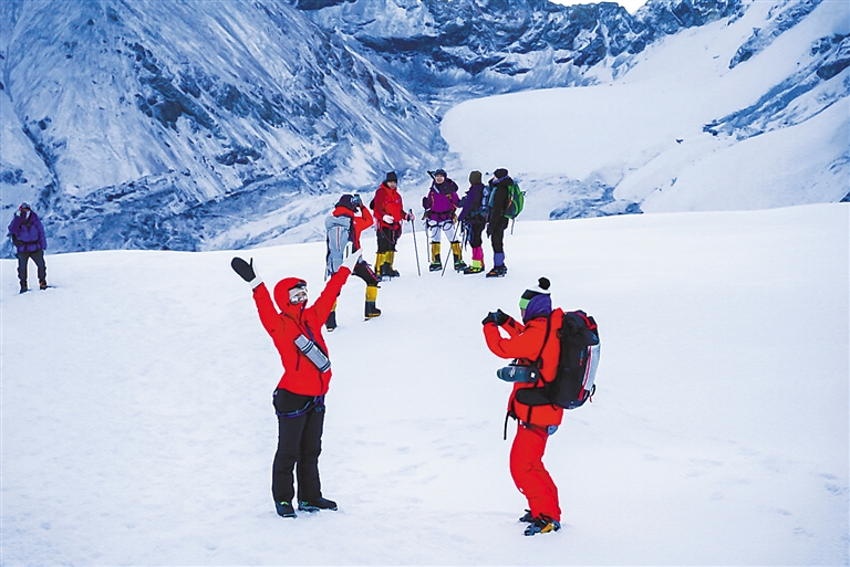 此時(shí),倘若從山腳往上看,與雄偉圣潔的雪山相比,緩緩行進(jìn)的登山者們是如此渺小,又如此頑強(qiáng)?!皼]有比人更高的山,沒有比腳更長的路?!痹陬B強(qiáng)意志的支撐下,在向?qū)У膸椭拢谔魬?zhàn)中不斷超越自我,最終,絕大部分山友沖頂成功,齊聚海拔6010米的洛堆峰頂,以實(shí)際行動(dòng)慶祝中華人民共和國成立75周年。大家或在洛堆峰紀(jì)念碑前拍照打卡,或組織團(tuán)隊(duì)成員拿出提前準(zhǔn)備好的橫幅道具拍攝視頻,表達(dá)對祖國或者家人的祝福,登頂成功的喜悅洋溢在洛堆峰頂稀薄的空氣中。