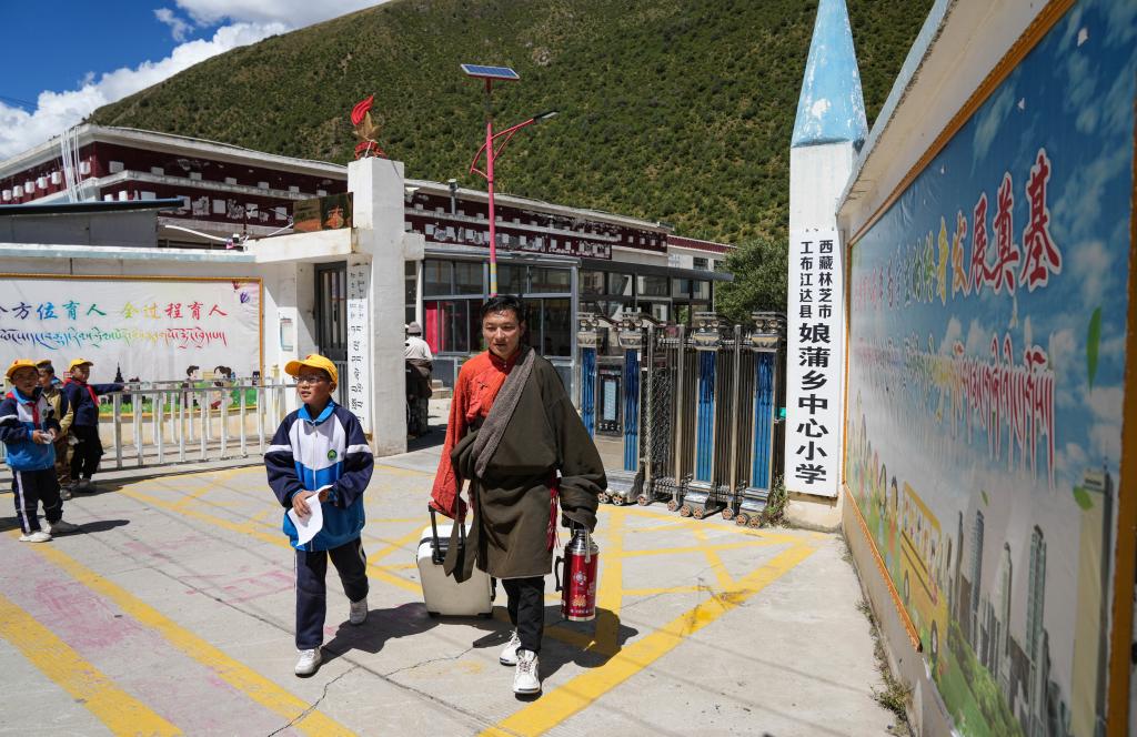娘蒲鄉(xiāng)中心小學門口,王登領著兒子貢喬熱旦(左)準備回家(9月4日攝)。新華社記者 晉美多吉 攝