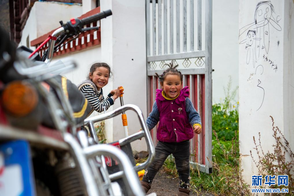 10月19日,在西藏昌都市卡若區(qū)境內拍攝的小朋友(無人機照片)。新華網 旦增努布 攝